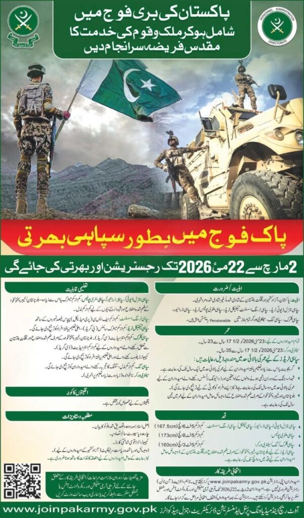 The Pakistan Army Sepoy Recruitment 2026 drive aims to recruit energetic young candidates who wish to start their military careers as soldiers. The Personnel Administration Directorate at GHQ Rawalpindi manages the recruitment system, and army selection and recruitment centres across the country execute it.